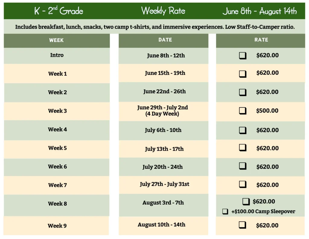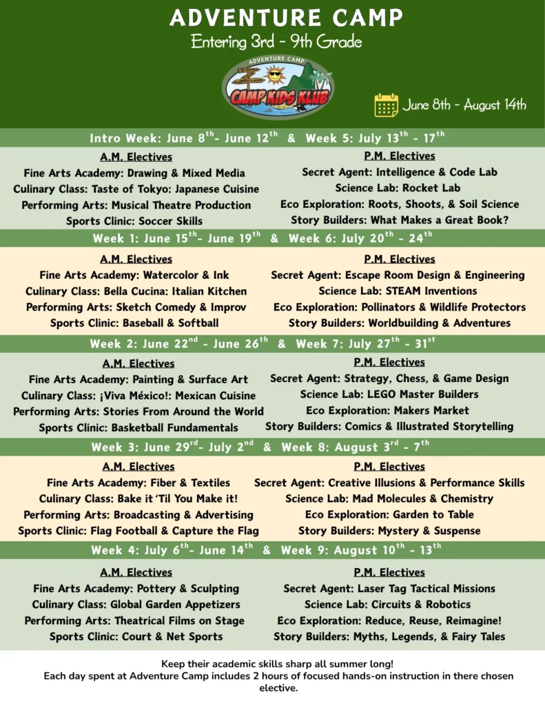 Our adventure-based camp is intentionally designed to grow with your child. Younger campers (K–2) explore a wide range of adventures daily, helping them discover interests in a fun, low-pressure way. As campers enter 3rd grade and beyond, they transition into a focused model choosing two adventures per week and developing deeper skills, independence, and confidence. This progression helps campers feel empowered, prepared, and excited as they grow year after year.