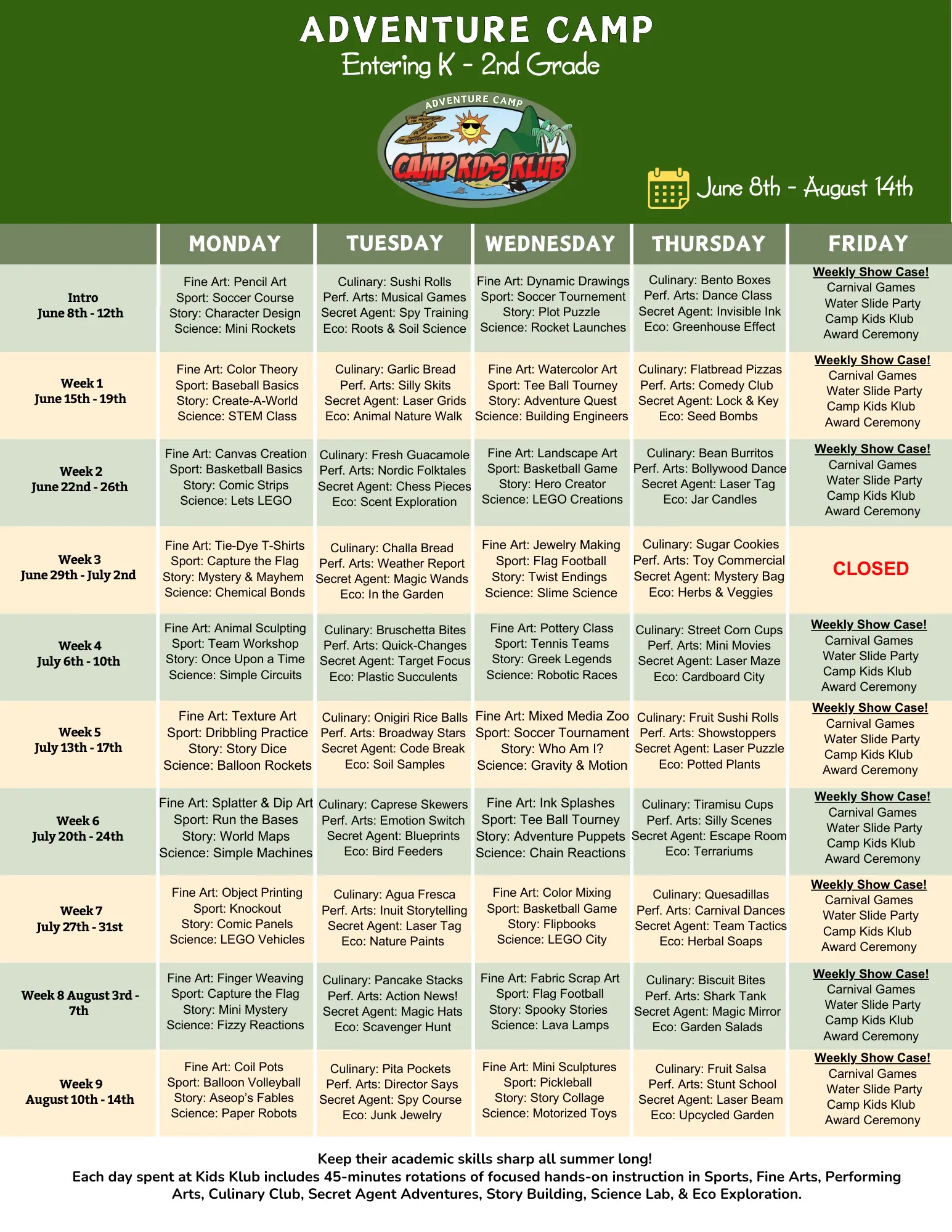From Fine Arts Academy, Cooking Club, Sports Clinic, Performing Arts, and Secret Agents to Eco & Garden Explorers, Science Lab, and Storytelling & Writing, each adventure is led by experienced instructors who inspire creativity, curiosity, and growth. Campers don’t just try activities—they live their fantasy, learn from experts, master new skills, & take their confidence to a whole new level!
