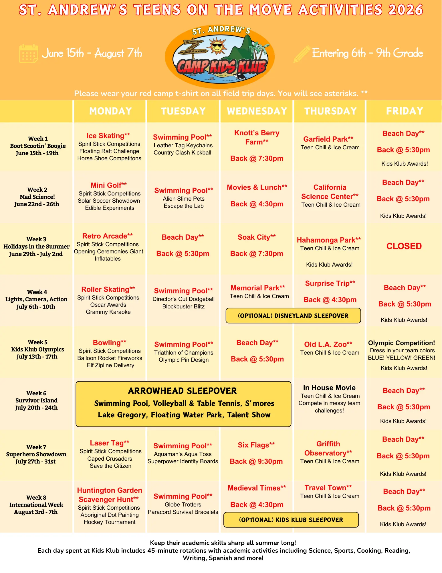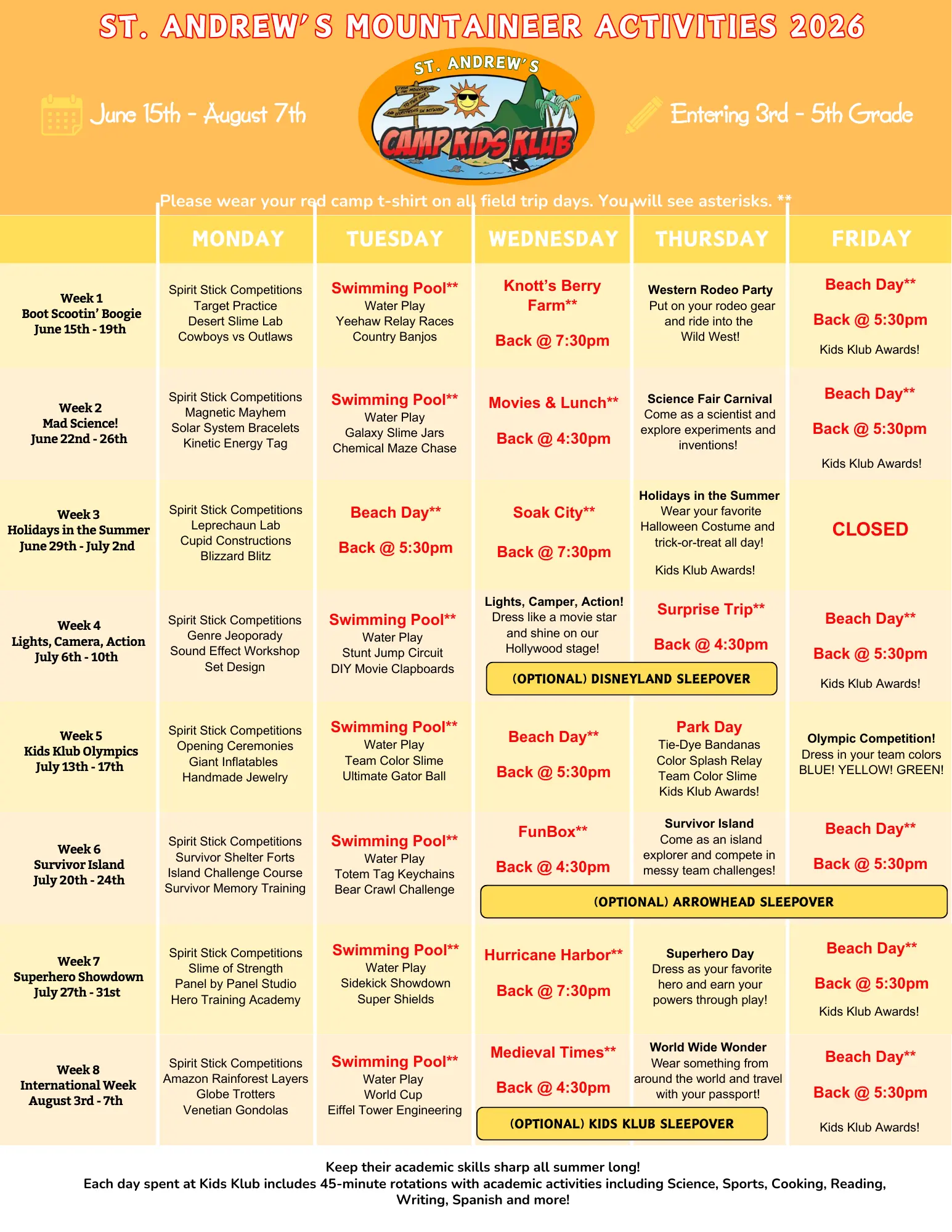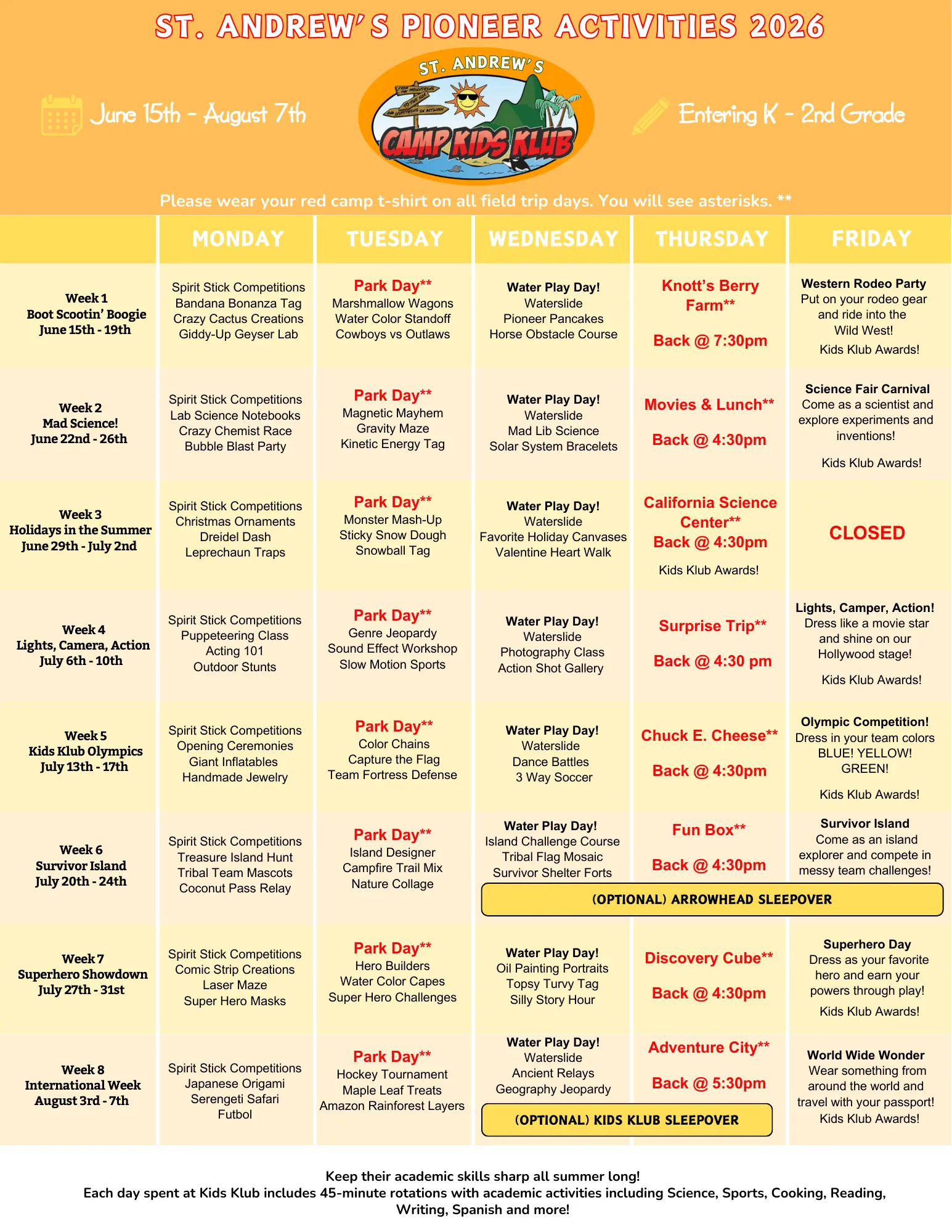 Our Summer Camp at St. Andrew’s runs from June 15 through August 7 and serves campers entering Kindergarten through 9th grade. Campers are grouped by age and rotate throughout the campus to enjoy a wide variety of activities, with new themes each week. Campers also enjoy weekly field trips, giving them exciting off-site adventures, and have the opportunity to participate in optional overnight experiences for an extra dose of fun and independence. With caring staff and a strong focus on safety, structure, and fun, this location provides a supportive environment where campers can explore new interests, build friendships, and create